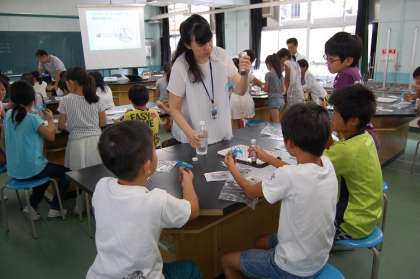 9月6日(火) 関西電気保安協会の方を招いて、4年生が備長炭電池を作りました。炭にキッチンペーパーとアルミホイルを巻きつけた後、電線を炭とホイルの二か所に巻きつけ、モーターとプロペラを取り付けました。そして、キッチンペーパーに塩水をしみ込ませていくと、プロペラが回りだしました。備長炭でも、乾電池と同じようにアルミイオンを発生させることで電池となることを知り、実験を楽しむことができました。