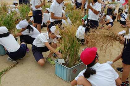 10月19日(水) 春に田植えをして育てたきた稲を、5年生の児童が収穫しました。今年の夏は気温が高く、夏休み中にイネの花が咲き出しました。2学期になって、稲穂が出てきたので、スズメ対策としてネットを張りましたが、ネットに近かった穂は、上手に食べられたものもありました。しかし、子ども達は、お米ができていることを実感したようで、これから行う脱穀や籾摺りを楽しみにしていました。