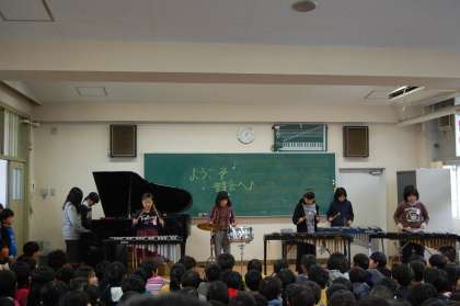 12月13日(火) 音楽クラブが、昼休みを利用して音楽会を開き、木曜日のクラブ活動の時間に、4〜6年生の児童が合奏や合唱の練習をしてきた成果を披露しました。音楽会の開催は、朝会や玄関のポスターで全校児童に知らせたので、音楽室には大勢の子ども達が集まりました。君のようになりたい・名探偵コナン・空も飛べるはず の曲目を、ピアノ・小太鼓・鉄琴・木琴等を使って一生懸命演奏したので、会場は大きな拍手で包まれました。