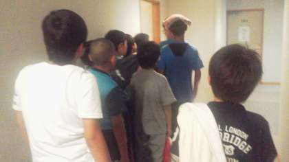 使った鍋や飯ごうを念入りに洗って、宿舎の方のチェックが済むと、おやつに冷えたスイカが出ました。屋外で食べたので、豪快に種飛ばしに挑戦する姿もありました。4時からは、入浴。お風呂場の前で順番を待ちながら、登山やカレー作りの汗を、早く流したいと思っているようです。