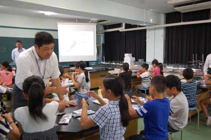 9月1日(金) 関西電気保安協会の方を招いて、4年生が手作り電池の学習を行いました。備長炭の端に電線を巻き、食塩水に浸したキッチンペーパーとアルミホイルを真ん中に巻いた上にもう一本の電線を巻くと、電極ができるようです。モーターとプロペラをその極に接続すると、クルクルとプロペラが回りだし、乾電池と同じ様な働きをすることが分かりました。おもちゃなどで乾電池を使った経験はありましたが、自分で備長炭を使って電池を作ることができて、子ども達は驚いていました。これからも、科学実験等に興味をもって取り組んで欲しいものです。