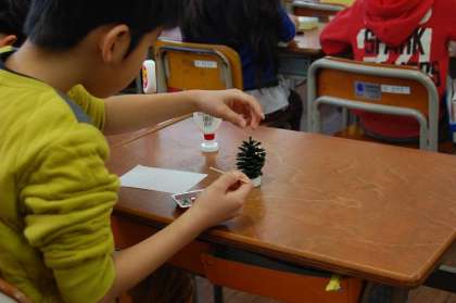 12月21日(木) 1年生が、生活科のおもちゃ作りで馴染んだ まつぼっくりを使って クリスマスツリーを作りました。モミの木の雰囲気を出すために緑色のスプレーで色をつけたまつぼっくりに、爪楊枝を使って飾りをつけていきました。最後は綿で雪の雰囲気を出して、できあがりです。期末個人懇談会も今日が最終日です。子どもたちは、来週からの冬休みを待ち焦がれているようです。