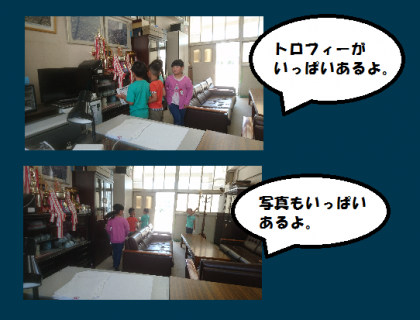 校長室にも来てくれました。お客様がすわるソファーにも座りました。