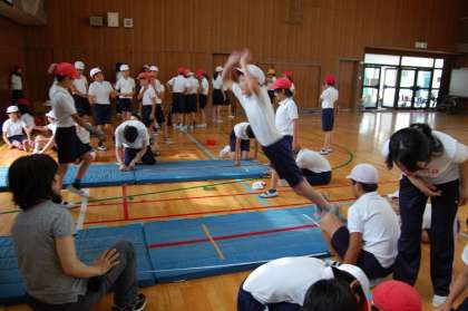 梅雨の晴れ間の6月10日(火)スポーツテストを全学年で行いました。運動場では50m走とソフトボール投げ、講堂では立ち幅跳びの測定をしました。(中高学年は、長座体前屈や反復横とび等も実施しました)児童数の増加のため増築をしたこともあって、休み時間には思い切って遊ぶことができにくい現状がありますが、工夫した体育の指導や業間の過ごし方、活発な地域のスポーツ活動により、運動をすることが好きと答える児童は増えています。スポーツテストでも、一生懸命持てる力を発揮しようと、がんばる姿が目につきました。