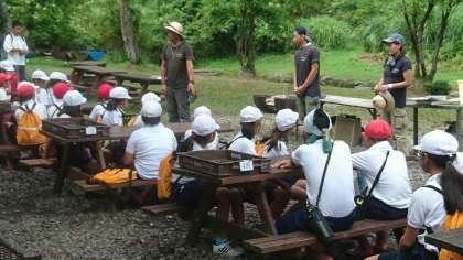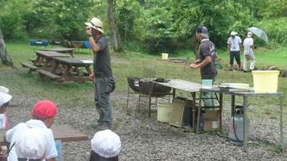 スタッフの朝倉さんの説明を聞いています。みんなが捕まえるのは、アマゴです。