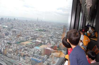 7月8日(火)3年生の子どもたちが、社会科の学習として、港区にある「ベイタワーホテル」の最上階にある開店前のレストランの窓から、大阪の町を眺めました。西側では、大阪港に流れ込む安治川や淀川、遠くは神戸の港まで見ることができました。東側に目を移すと、生駒山から市内中心部のビル群まで、手に取るように見えました。校区にあるタワーマンションを見つけると、その方向の奥にアベノのハルカスが高くそびえ立っていることにも気づきました。