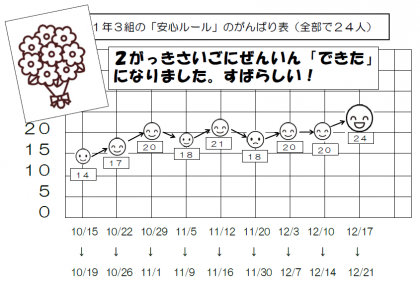 1年生は、3クラスとも「なまえをよばれたら、「はい」とへんじをしよう」という重点ルールでした。また、1組は、途中で全員「できた」を達成したので、大きな声で返事をしようという追加項目が加わりました。