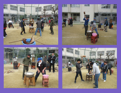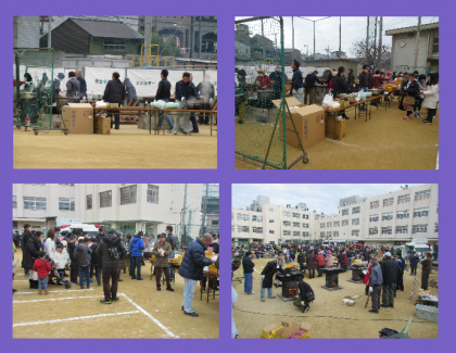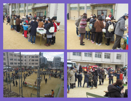 やきいも、もちつき、豚汁、工作、お楽しみ会、起震車体験などたくさんのコーナーがありました。