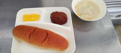 今日の給食は、焼きハンバーグ、豆乳スープ、ダイスゼリー(みかん)、黒糖パン、牛乳です。本日より給食が始まり、2学期も少しずつ動き出してきました。給食室前では、給食当番が「いただきます」と元気な声を出し、給食室の中に響いています。給食を食べて暑さに負けずに今週1週間も乗り切りましょう。