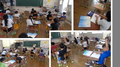 1年生の5時間目の授業の様子です。1組では、詩の学習を、2組では図書の学習でした。暑さが厳しい中の5時間目ですがどの子たちも集中して学習に取組んでいます。