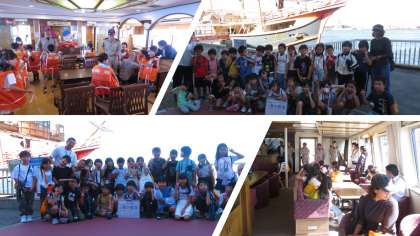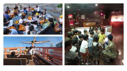 午前中、サンタマリア号では、船員さんのお話を聞き、大阪湾の心地よい風を感じながらのクルージングを楽しみました。