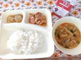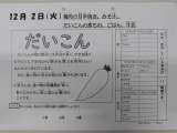 12/2今日の給食は「鶏肉の甘辛焼き、みそ汁、だいこんの煮もの、ごはん、牛乳」です。 鶏肉の甘辛焼きは、児童に人気の献立です。