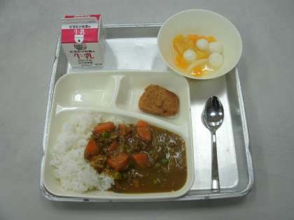 今日の給食は、カツカレーライス、フルーツ白玉、牛乳です。