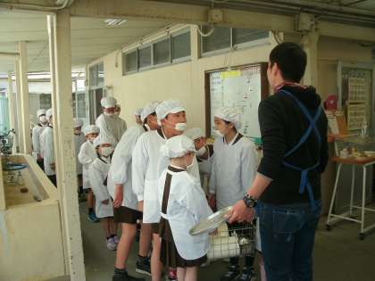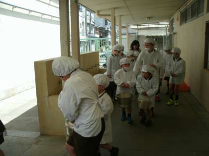 今日から6年生といっしょに給食室におかずや牛乳、食器を取りに行きます。
