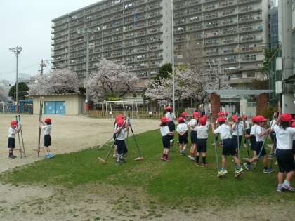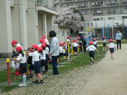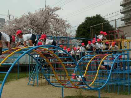 1年生は、体育の時間に運動場の遊具の使い方を学習していました。