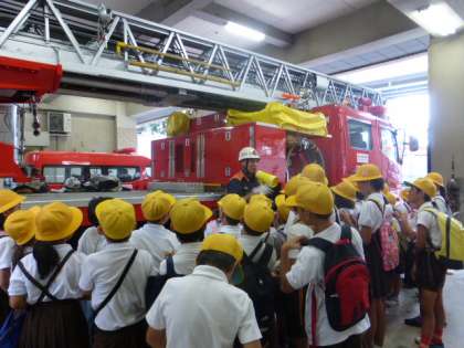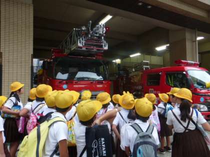最後に、はしご車の説明を聞きました。11階の高さまで登れるそうです。消防署のお仕事を説明してくださった職員の方々にお礼を述べて、学校に帰りました。