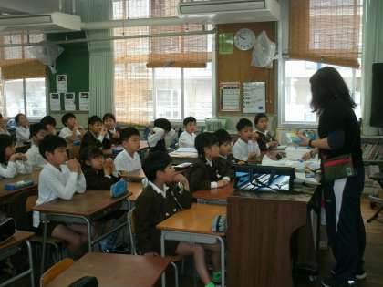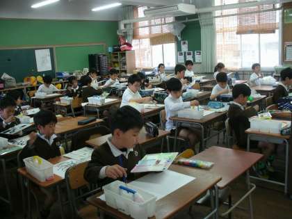 教室で水彩絵の具の使い方を学習した後、学習室と教室に分かれて
