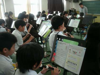 5年生は、音楽室でリコーダーの練習をしていました。