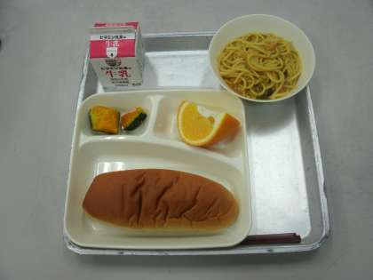 今日の給食は、カレースープスパゲッティ、焼きかぼちゃ、あまなつかん、黒糖パン、牛乳です。