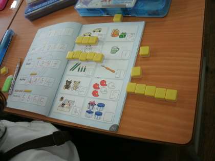ブロックで確認しながら、1から5までの数の学習をしていました。