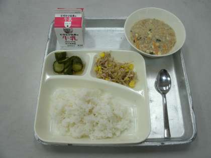 今日の給食は、マーボー豆腐、きゅうりの甘酢漬け、もやしとコーンのごまいため、ごはん、牛乳です。