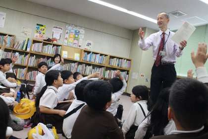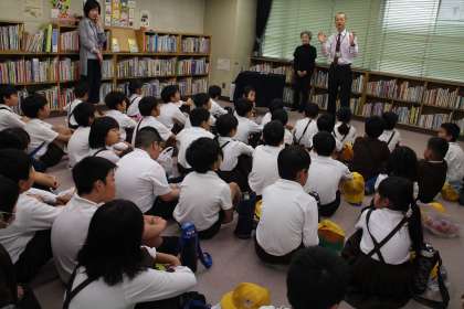 いつも磯路小学校に来てくださる「音羽っ子」の方の読み聞かせで始まり、港図書館の館長さんに港図書館について、わかりやすく紙芝居で教えていただきました。