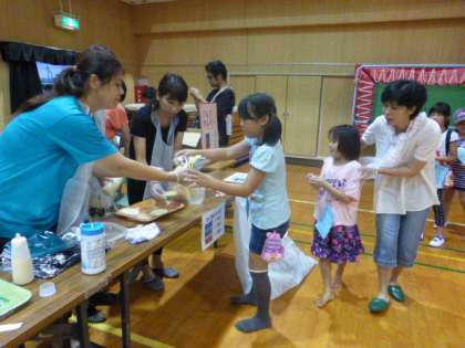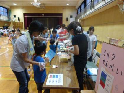 9月6日(土)午後6時よりPTA主催による磯路ふれあいカーニバルが開かれました。あいにくの雨天でしたが、たくさんの子どもたちや保護者の方々にご参加いただきました。お世話をいただいたPTAや地域の皆様方、本当にありがとうございました。講堂と廊下にたくさんのコーナーを作って子どもたちを迎えました。ミルクせんべいのコーナーの様子です。