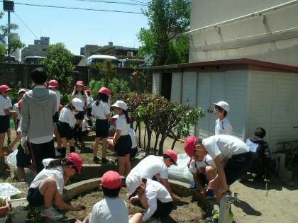 4年生は、体育の時間の後半を利用して、学習園の雑草抜きをしていました。