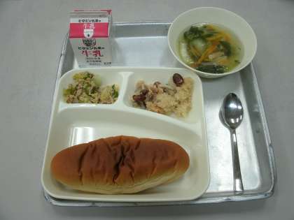 今日の給食は、金時豆の中華おこわ、中華スープ、ツナと野菜のオイスターソースいため、黒糖パン、牛乳です。