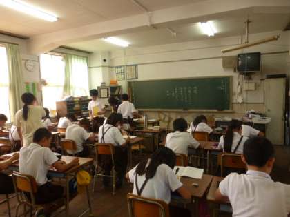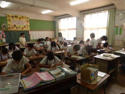 6年生は、国語の時間に作った短歌の清書とはがき書きをしていました。