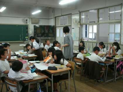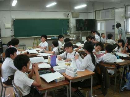「ヤドカリとイソギンチャク」を読んで疑問に思ったことや感想をグループで発表しあっていました。