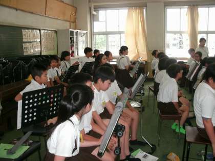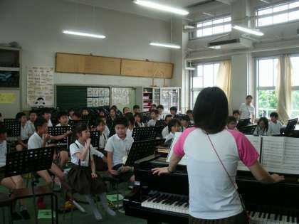 5年生は、音楽室で合奏の担当楽器を話し合って決めていました。