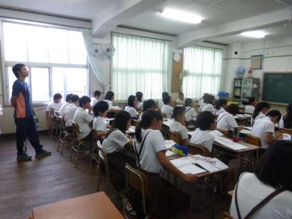 6年生は、算数の時間に1つの教室に集まって学習していました。「2つの数で割合を表そう」という単元で、ミルクとコーヒーをはかっておいしいミルクコーヒーを作る計算を学習しました。