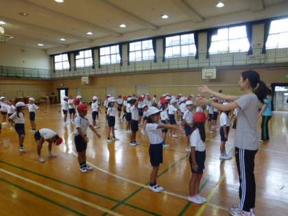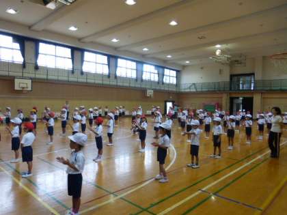 いよいよ運動会の練習が始まりました。まずは、講堂で音楽を聞いて、音楽に合わせた手拍子をするところから練習していました。