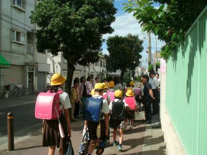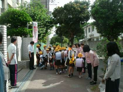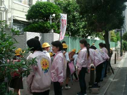 毎月第1・第3月曜日は、港区更生保護女性会の皆さんによる「愛の一声運動」が朝の登校時に行われます。ありがとうございます。