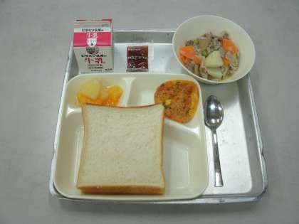 今日の給食は、豚肉と野菜のスープ煮、変わりピザ、ミックスフルーツ(缶)、食パン、いちごジャム、牛乳です。