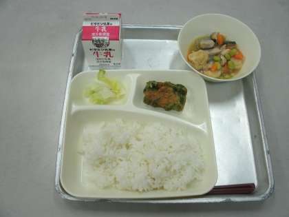 今日の給食は、ちくわのいそべあげ、鶏肉と一口がんもの煮物、あっさりきゅうり、ごはん、牛乳です。