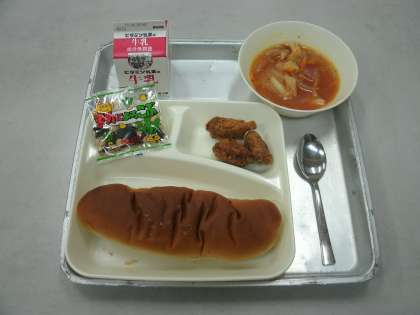 今日の給食は、一口トンカツ、ミネストローネ、豆こんぶ、黒糖パン、牛乳です。