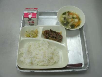 今日の給食は、プルコギ、チンゲンサイとコーンのゆずの香あえ、とうふのスープ、ごはん、牛乳です。