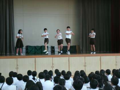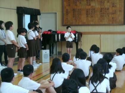 計画委員会の児童が、今年のめあて「ウキウキランドでもりあがろう」を発表しました。
