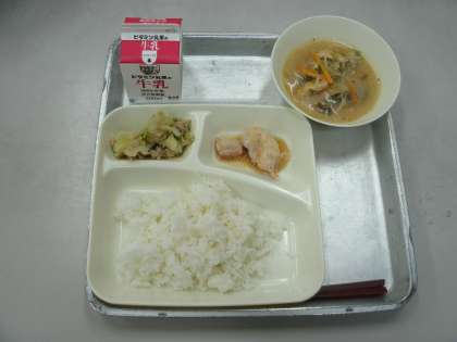 今日の給食は、鶏肉のおろしじょうゆかけ、みそ汁、野菜いため、ごはん、牛乳です。