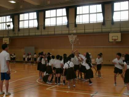 今日は、あいにくの雨ふり。体育館で15分休憩に玉入れ大会を行いました。