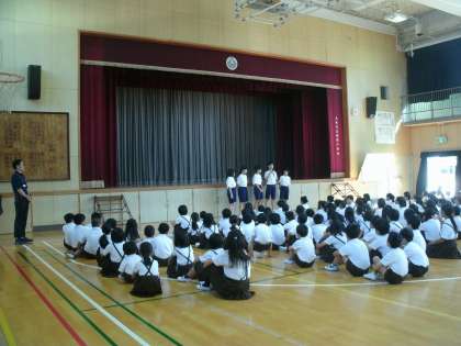 児童集会で自己紹介をしました。2日間よろしくお願いします。