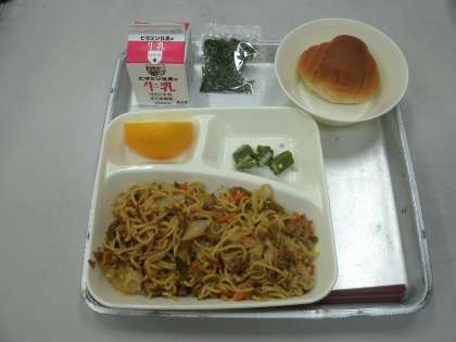 今日の給食は、焼きそば、オクラのかつお梅風味、オレンジ、黒糖クレセントロールパン、牛乳です。