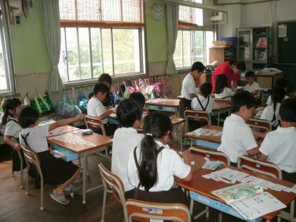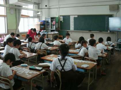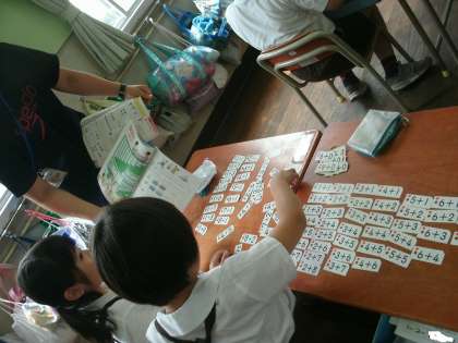 たしざんカードをならべて、計算のきまりを見つけていました。