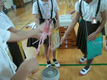 風やゴムを用いたおもちゃで遊ぶことを通して、風やゴムの性質に気が付きます。