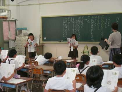 「お手紙」の登場人物、がまくん、かえるくん、かたつむりくんの役割分担をして動作化をしていました。