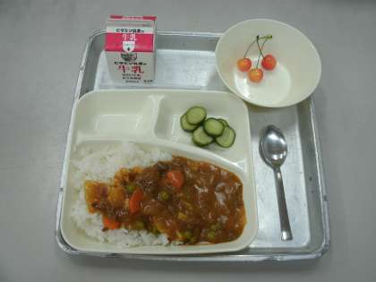 今日の給食は、ハヤシライス、きゅうりのサラダ、さくらんぼ、牛乳です。