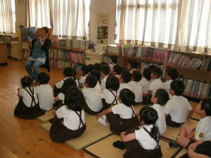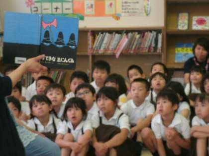 学校図書館補助員さんに「すてきな三人組」の読み聞かせをしてもらいました。