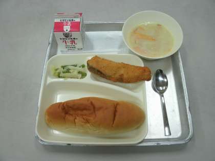 今日の給食は、サーモンフライ、豆乳スープ、キャベツとさんどまめのサラダ、黒糖パン、牛乳です。